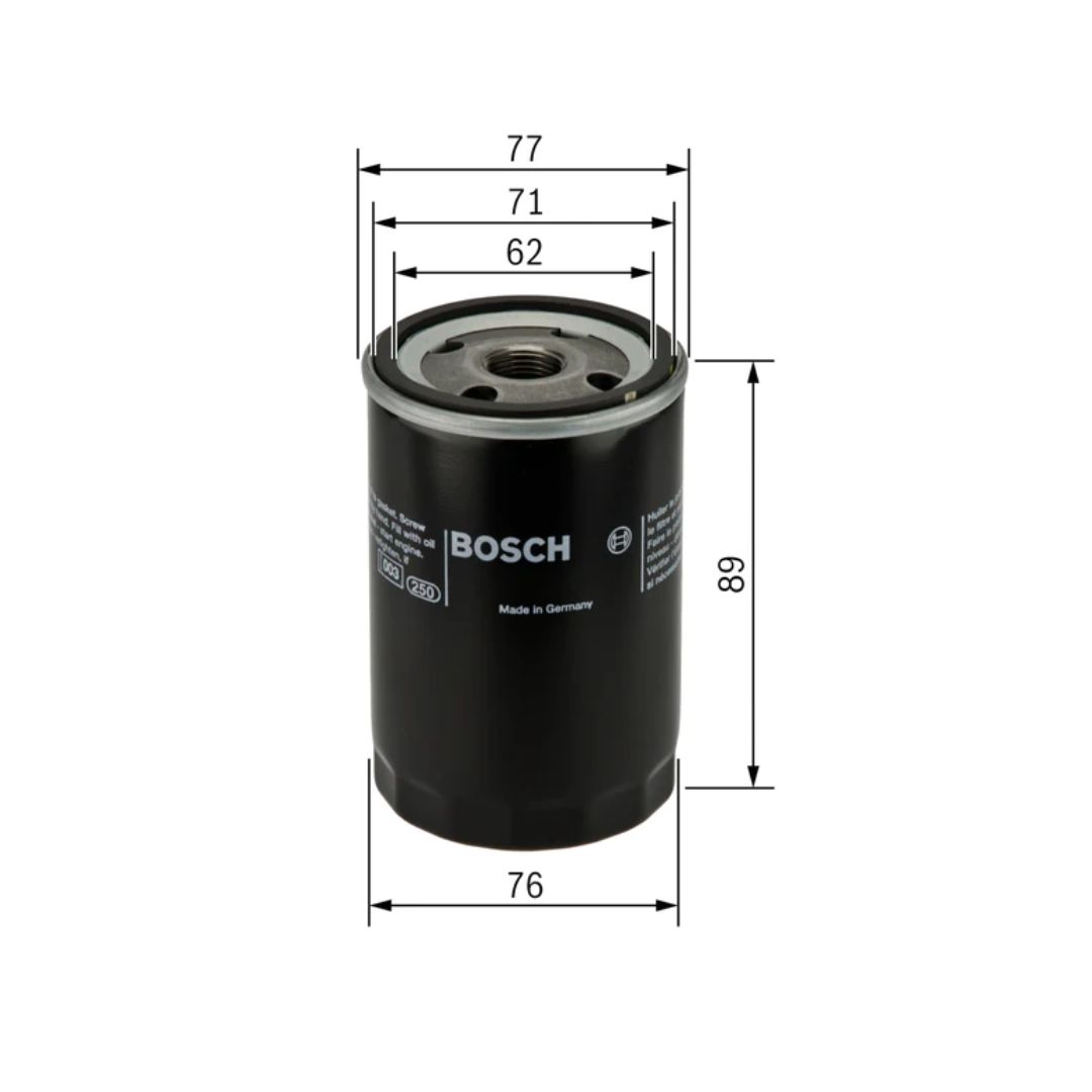 BOSCH Oil Filter Chevrolet - OpelOuter Diamter 1 (mm) = 77Outer Diamter 2 (mm) = 76Height (mm) = 89Internal Diameter 1 (mm) = 71Internal Diameter 2 (mm) = 62Connecting Thread = M18 X 1.5